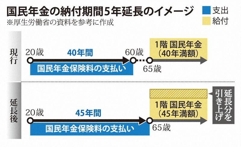 日本社会保障审议会宣布,为了确保养老金的支付财源,正在研究将国民年金的保险费缴纳期间从40年(20~59岁)延长到45年(20~64岁)。