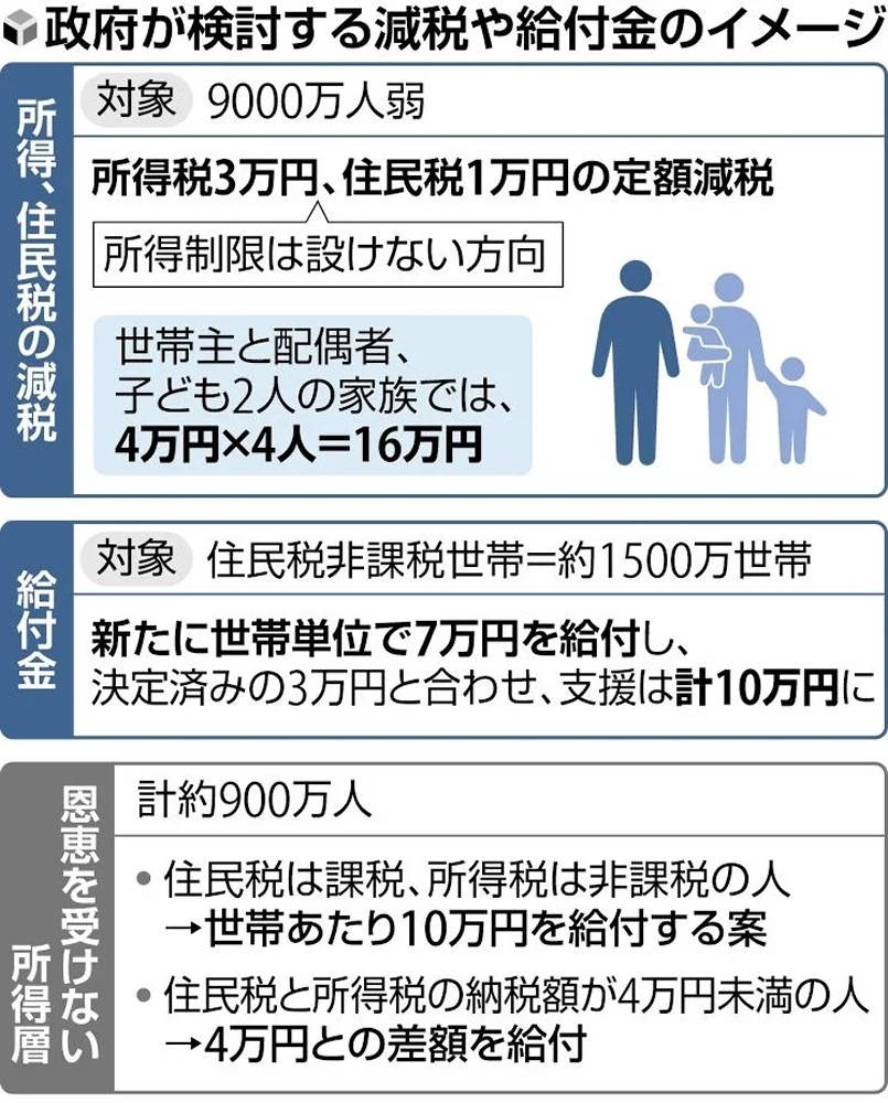 对于居民税课税、所得税不课税的约500万人,每户支付10万日元补贴;对于居民税和所得税都被征收,但纳税额低于4万日元的约400万人,将考虑弥补差额部分。