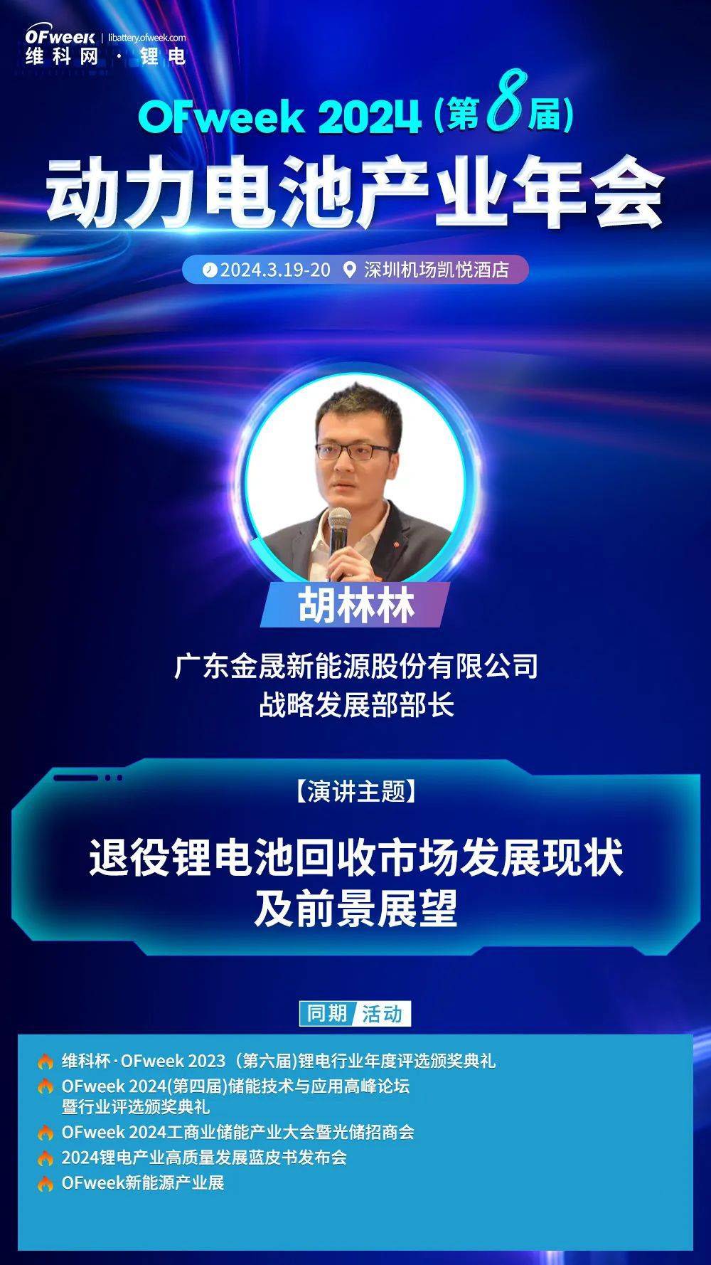 本次OFweek 2024(第八届)动力电池产业年会,广东金晟新能源股份有限公司战略发展部部长胡林林确认出席并做专题演讲,演讲主题为《退役锂电池回收市场发展现状及前景展望》。