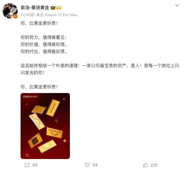 当日,追觅科技CEO俞浩发布多条微博提到此事,其中一条微博称,“你,比黄金更珍贵!”红星新闻记者注意到,俞浩的微博名字也改成了“俞浩-爱送黄金”。