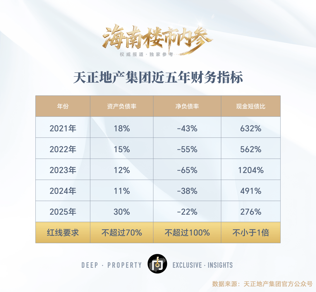 而这5年,天正的财务指标一直保持“常绿”的状态。2021年,剔除预收款项后资产负债率18%,净负债率-43%,现金短债比632%;2022年,剔除预收款项后资产负债率15%,净负债率-55%,现金短债比562%……截止到2025年12月份,资产负债率30%(不含预收款的资产负债率),净负债率-22%,现金短债比率276%。