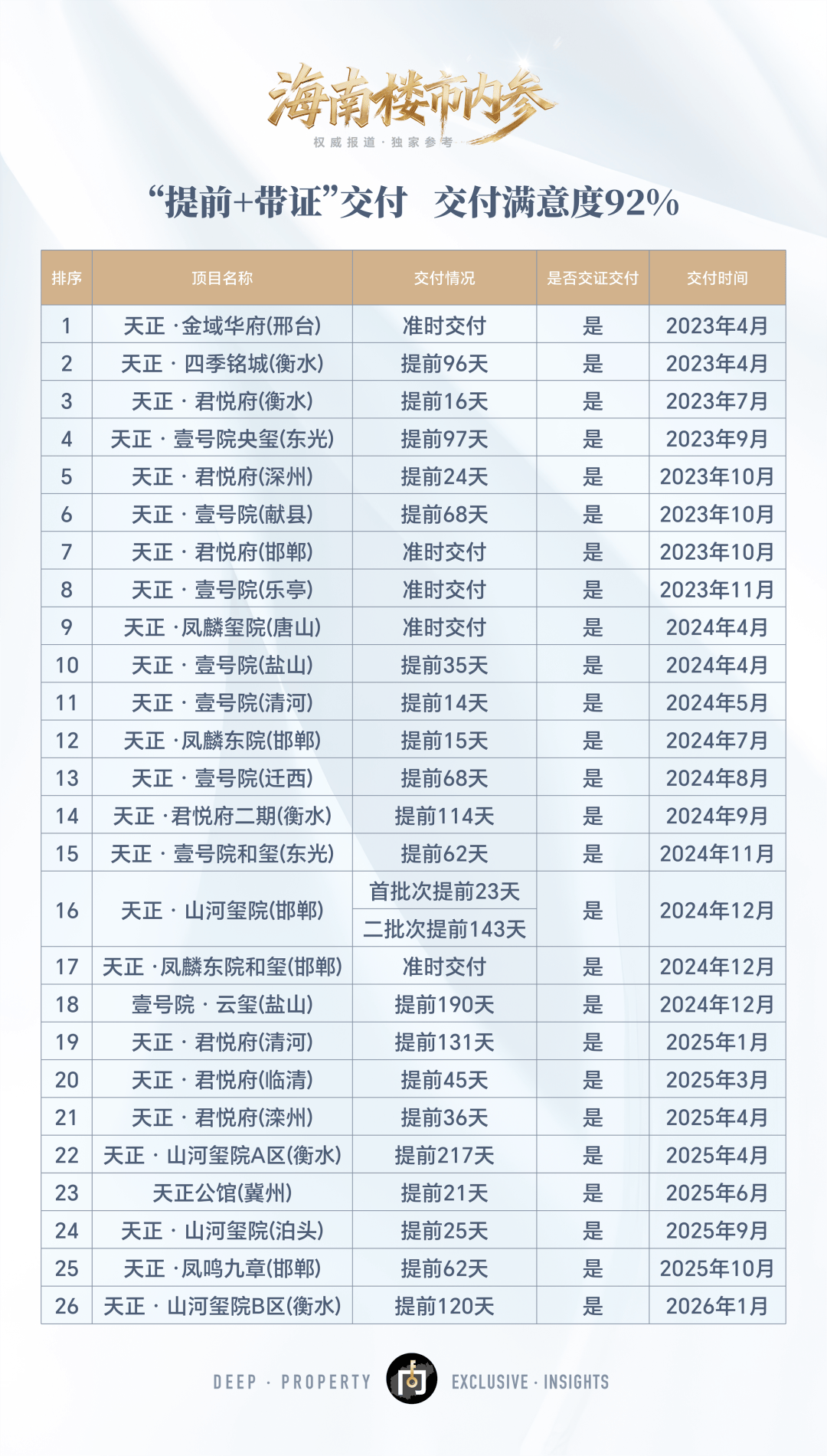数据显示,截止目前天正集团在全国累计交付30100套住房——零延期;交付满意度连续多年高达92%。2025年,更实现了100%提前交付。在行业频繁上演交付危机的背景下,这一数据显得尤为亮眼。