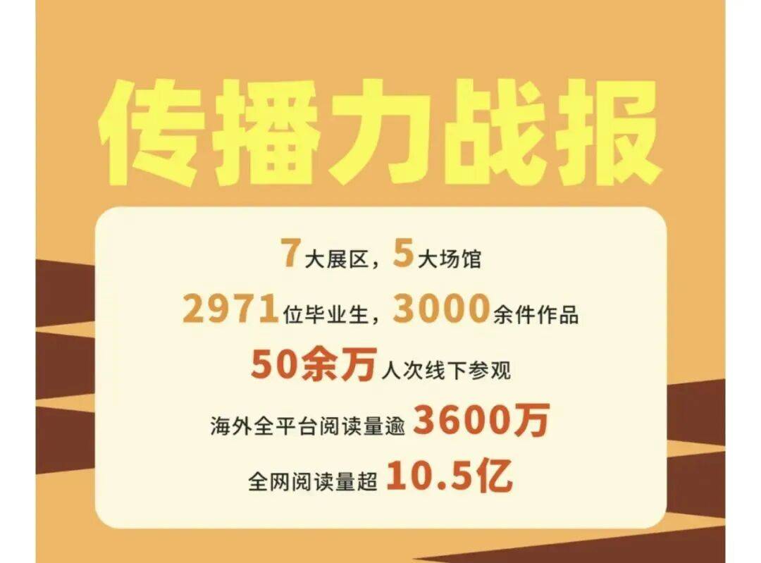 七十二变——2025中国美术学院毕业季,7大展区,5大场馆,971位毕业生,3000余件作品,50余万人次线下参观,海外全平台阅读量逾3600万,全网阅读量超10.5亿。